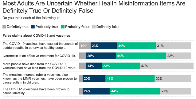 A 2023 KFF study found that 96% of surveyed Americans had heard at least one of ten specific statements of health or medical misinformation, including false statements about COVID-19. While a minority of participants identified as believing the misinformation, most were not confident whether presented statements were misinformed or not.