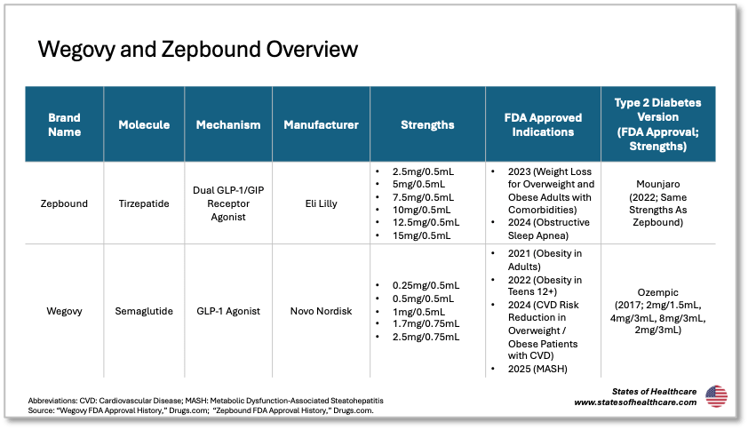Ozempic is a weekly injected glucagon-like peptide-1 (GLP-1) and was approved by the FDA in 2017. Although Ozempic is a household name synonymous with weight loss, and a catchy jingle, it is specifically approved for use by people with Type 2 diabetes seeking to control their blood sugar. Wegovy, which the FDA approved in 2021, is the same molecule from the same manufacturer but indicated for weight loss. This distinction is important and introduces lots of nuances related to access and affordability.