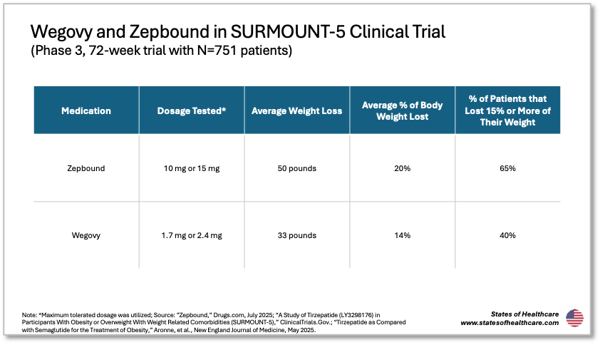 In 2023, dual GLP-1/GIP medication Zepbound gained approval for weight loss. Similar to the Ozempic dynamic, manufacturer Eli Lilly’s therapy Mounjaro had been available for Type 2 diabetics since 2022. In the SURMOUNT-5 clinical trial, patients utilizing Zepbound lost 50 pounds on average compared to the 33 pounds that patients utilizing Wegovy lost.
