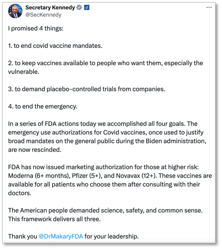 Also on August 27th, Kennedy announced via tweet that the FDA had ended the Covid-19 vaccines’ emergency use authorizations, narrowing their approved use to a smaller patient population of patients at “higher risk.”