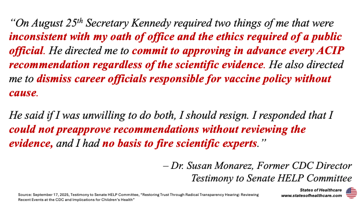 On August 25th Kennedy allegedly directed Monarez to commit in advance to approve future unknown changes to the childhood immunization schedule that Kennedy said would come from the September ACIP meeting. (The Secretary denies this.) Director Monarez also says that she resisted his direction for her to “dismiss career CDC officials responsible for vaccine policy without cause.”