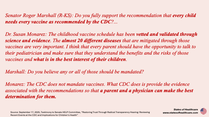 Typically, once the ACIP makes a recommendation, the CDC Director is tasked with approving, amending, or rejecting it based on the evidence. Former CDC Director Monarez testified before the Senate HELP committee that she was fired for her refusal to “commit in advance to approving every ACIP recommendation regardless of the scientific evidence” ahead of the September ACIP meeting.
