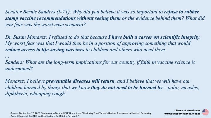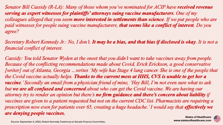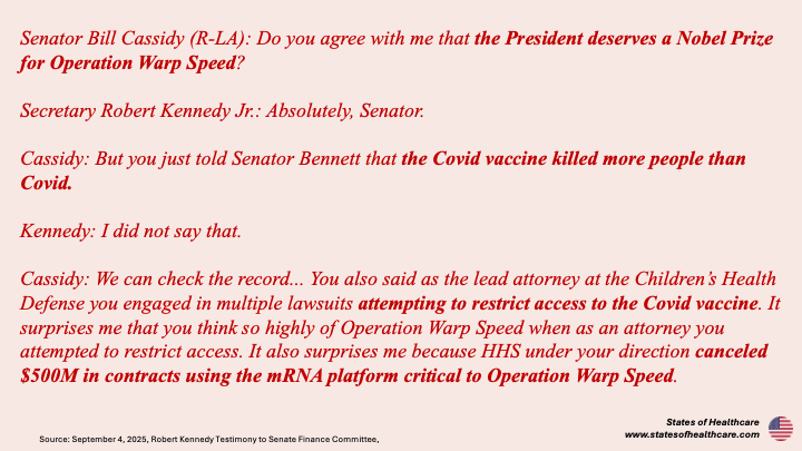 On September 4th Kennedy appeared before the Senate Finance Committee. The day prior, Dr. Houry released an op-ed in the Washington Post with several questions to ask Kennedy at the hearing. The day of the hearing Monarez released an op-ed in the Wall Street Journal about her firing. In combative exchanges, Kennedy testified before the Senate that the op-ed’s depiction of her firing was a lie.